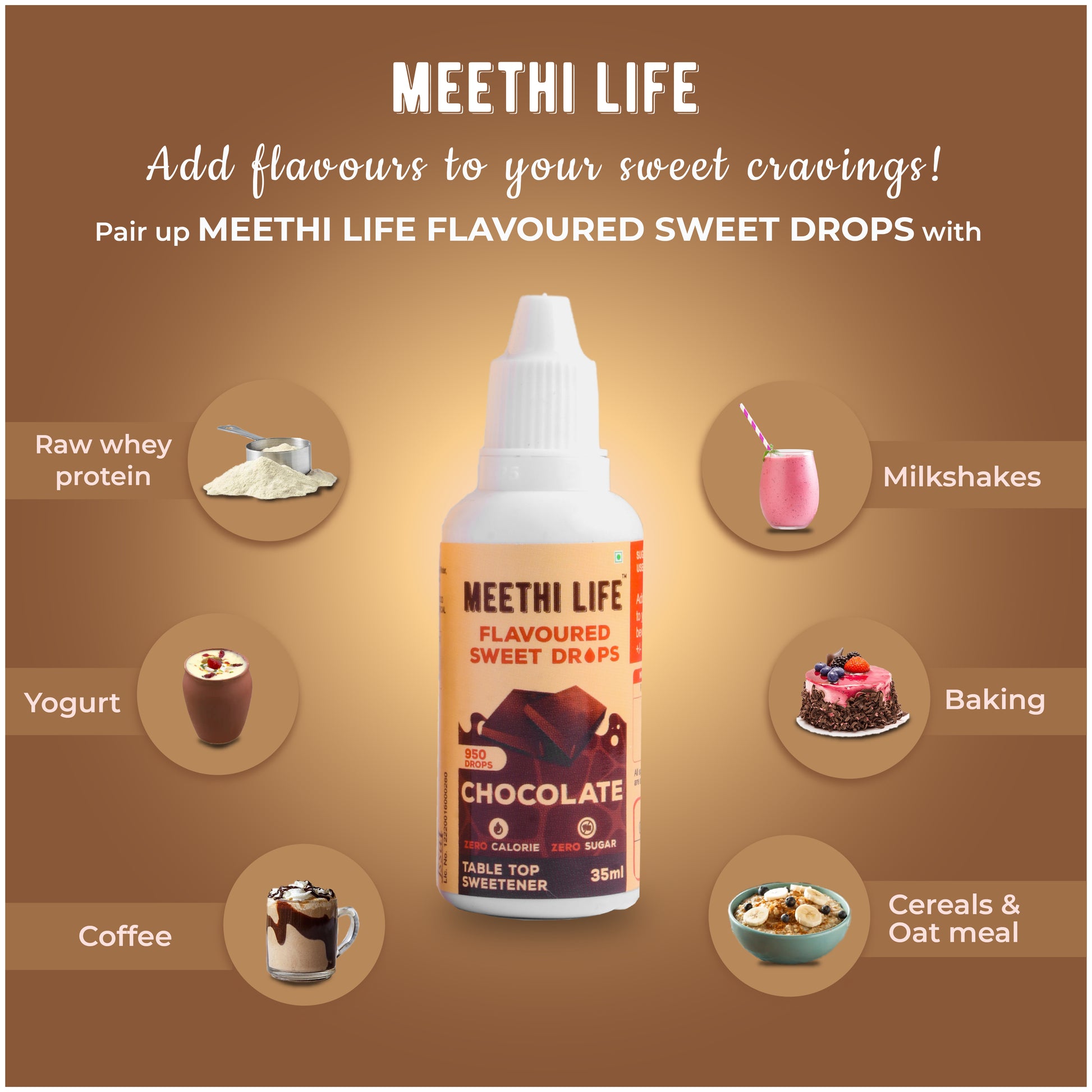 With Meethi Life Flavoured Sweet Drops now enjoy different flavours every day by mixing a few drops of this delightful liquid to your unflavoured whey protein, shakes & smoothies, oatmeals, baking and many more.